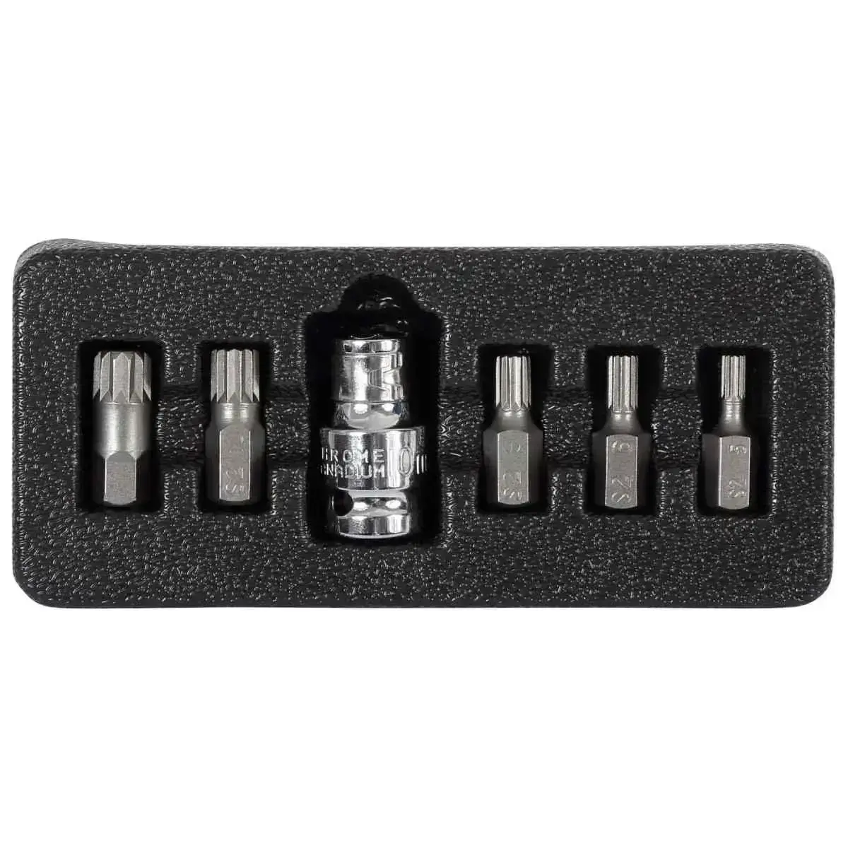 Komplektā ietilpst īsie (30 mm) SPLINE M5, M6, M8, M10, M12 uzgaļi un adapteris 1/2''.