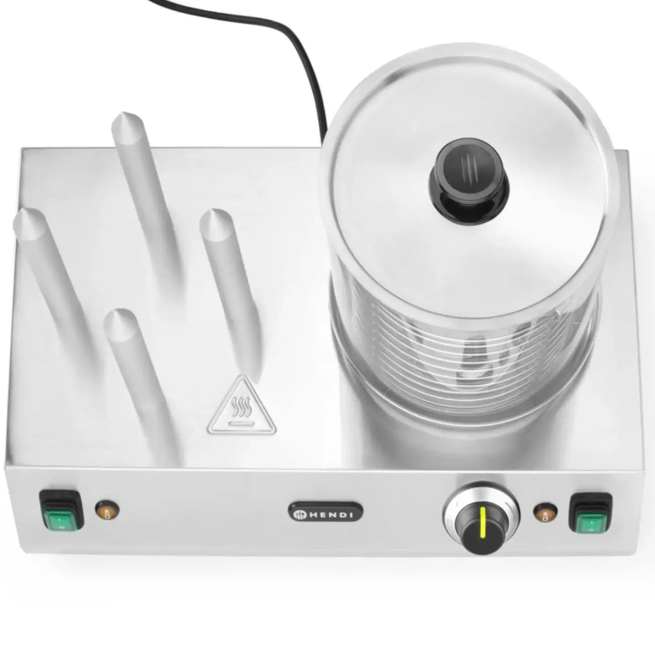 Podgrzewacz do parówek HENDI ma duży szklany cylinder, który chroni i eksponuje idealnie podgrzane kiełbaski. Zawiera przegródkę w koszyku, dzięki której można podgrzać dwa rodzaje kiełbasek jednocześnie, a cztery pręty grzejne utrzymują bułkę do hot dogów w cieple i gotowości do podania.