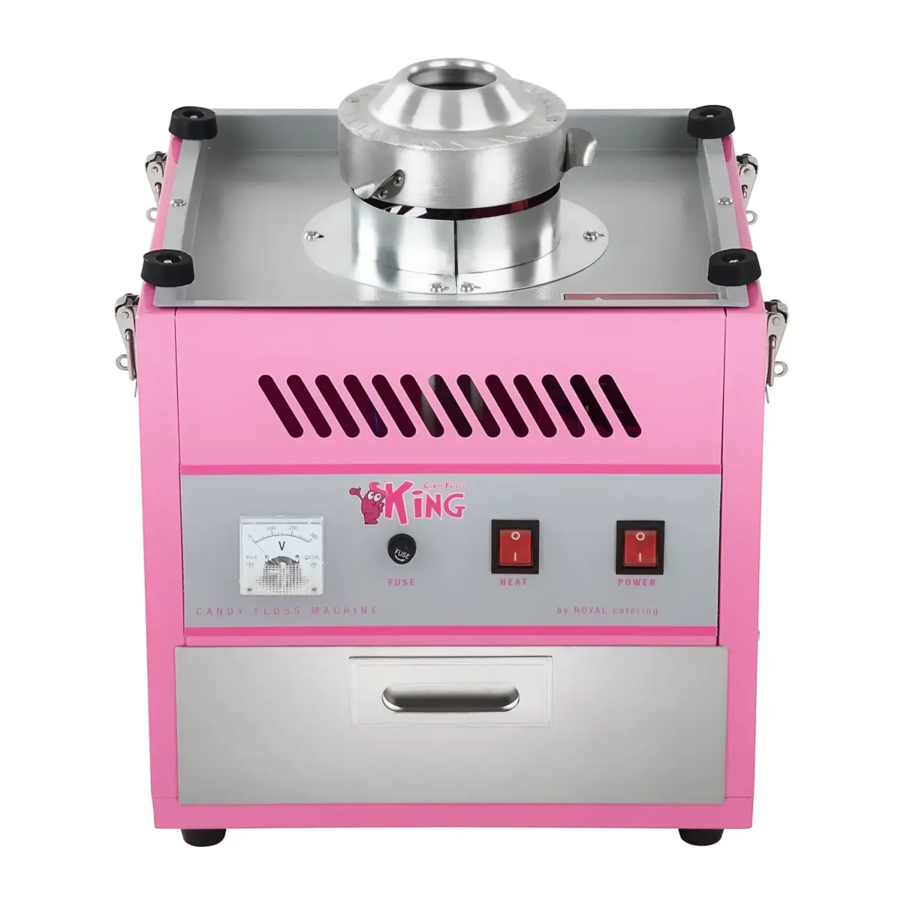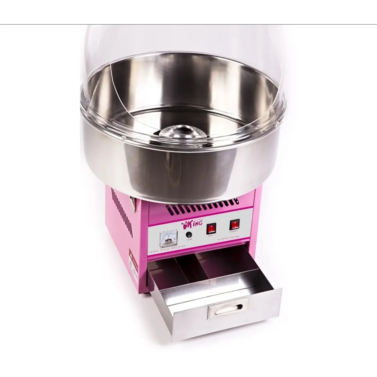Profesjonalna maszyna do produkcji waty cukrowej z kopułką chroniącą przed czynnikami zewnętrznymi. W dolnej części maszyny zamontowano praktyczną szufladkę na akcesoria i pieniądze.