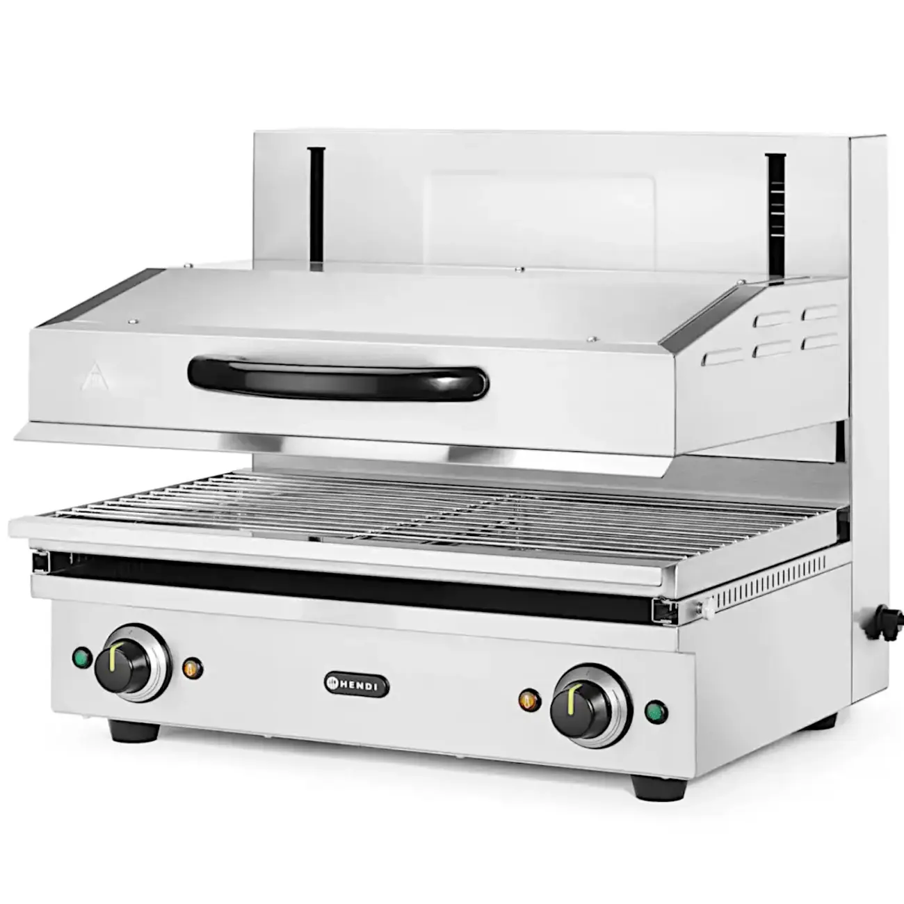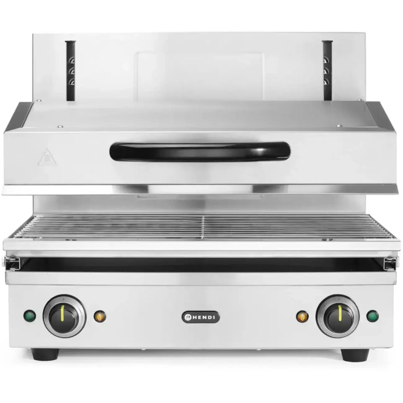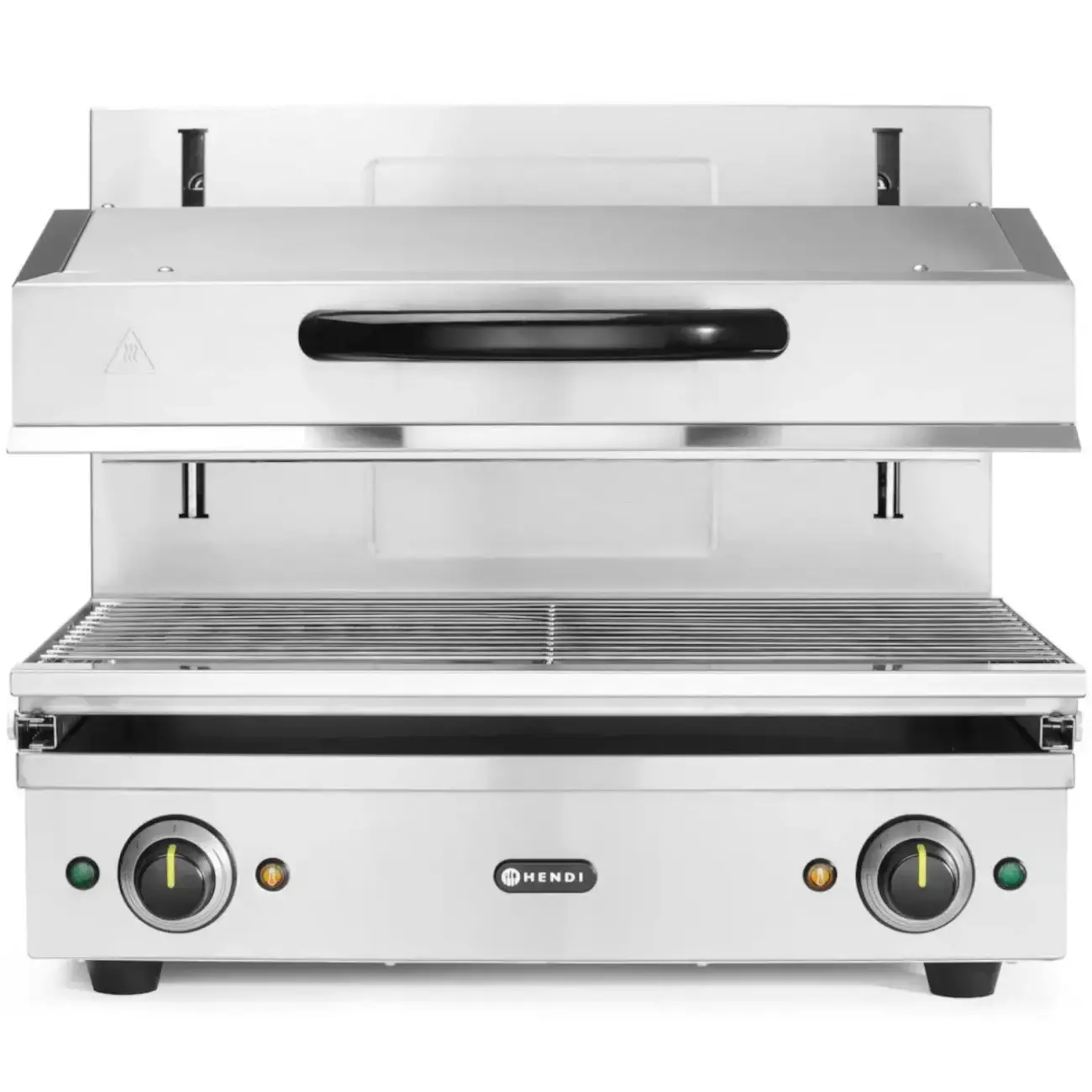 Salamander 600 HENDI umożliwia płynną regulację wysokości za pomocą idealnie działającego systemu podnoszącego w zakresie od 70 do 200 mm, zapewniając precyzyjną kontrolę podczas takich czynności jak grillowanie, opiekanie, topienie sera czy finalne wykańczanie potraw. Mechanizm zębatkowo-łańcuchowy zapewnia niezawodną codzienną pracę, a wyjmowana taca ociekowa i na okruchy z rusztem o wymiarach 590×350 mm ułatwia szybkie i efektywne czyszczenie.