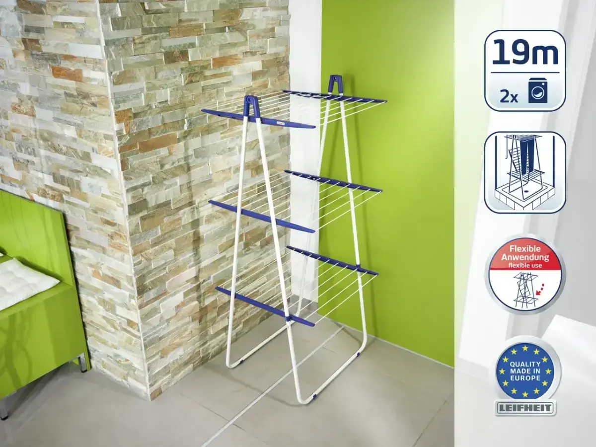 Paredzēts izžāvēt lielu daudzumu veļas (19m), pie tam neaizņem daudz vietas telpā. Vidējo līmeni var salocīt vertikāli, lai var izkārt garāku veļu. Piemērots izvietot dušas kabīnēs. 3 gadu garantija.