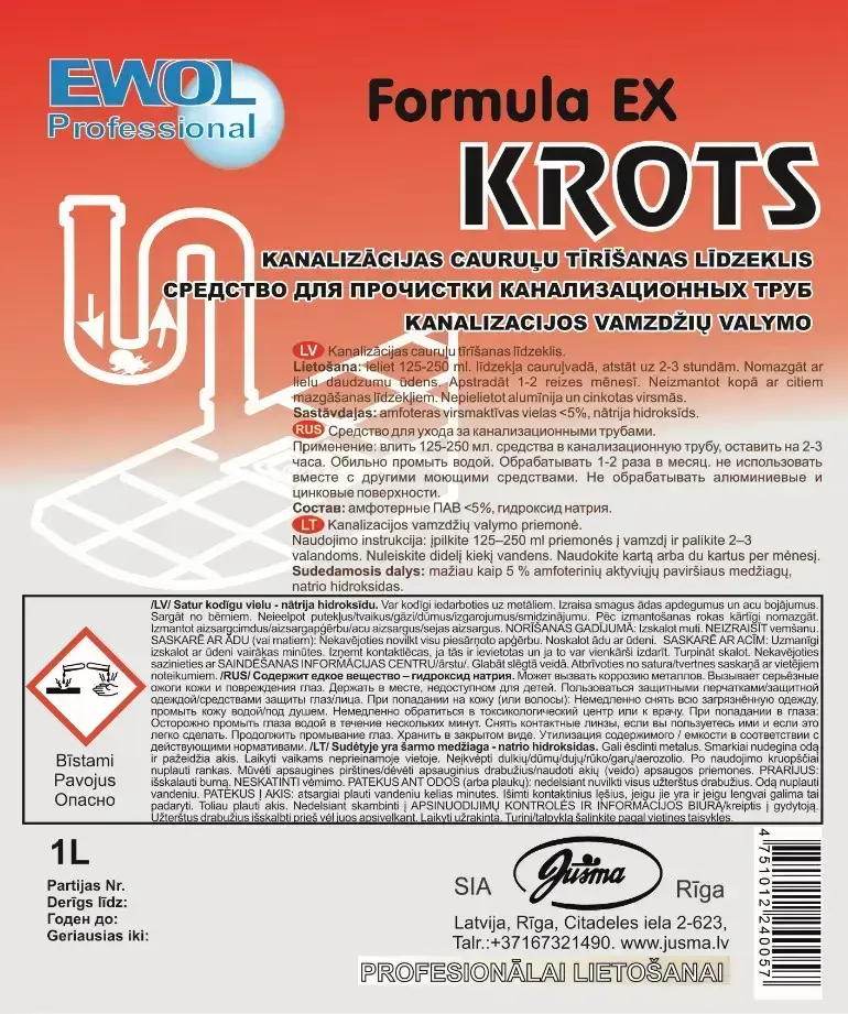 • Kanalizācijas cauruļu tīrīšanas līdzeklis • Lietošana: ieliet flakona 1/8-1/4 daļu cauruļvadā, atstāt uz 2-3 stundām. Nomazgāt ar lielu daudzumu ūdens • Apstrādāt 1-2 reizes mēnesī • Neizmantot kopā ar citiem mazgāšanas līdzekliem • Nepielietot alumīnija un cinka virsmās • pH > 12,5 (1 % ūdens šķīdums) • 1 L