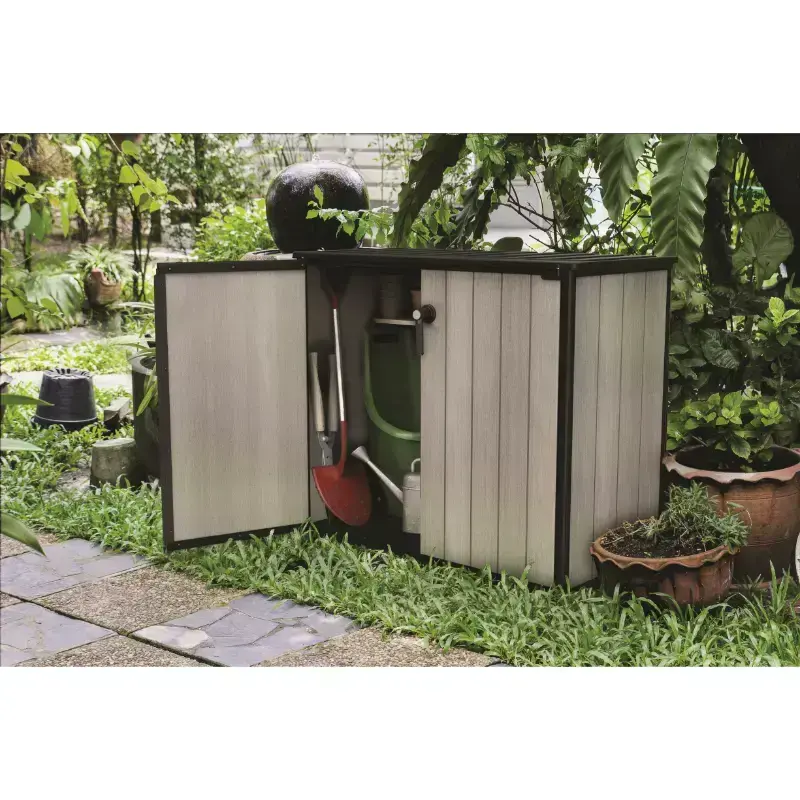 Uzglabāšanas šķūnītis Patio Store ir vienkāršs un elegants izpildījums ar daudzpusīgu krāsu gammu un virsmas tekstūru, kas atgādina dabīgu koku. Patio Store ir ideāls risinājums vietām, kur nepieciešams uzglabāt dārza piederumus vai sadzīves priekšmetus. Pateicoties tā optimālajam izmēram un horizontālajam dizainam, to var novietot dažādās vietās. Izturīgā konstrukcija pasargā uzglabātos priekšmetus no mitruma, un augstas kvalitātes plastmasa nodrošina, ka izstrādājums kalpos ilgus gadus. Papildu priekšrocība - to var nokrāsot jebkurā krāsā.