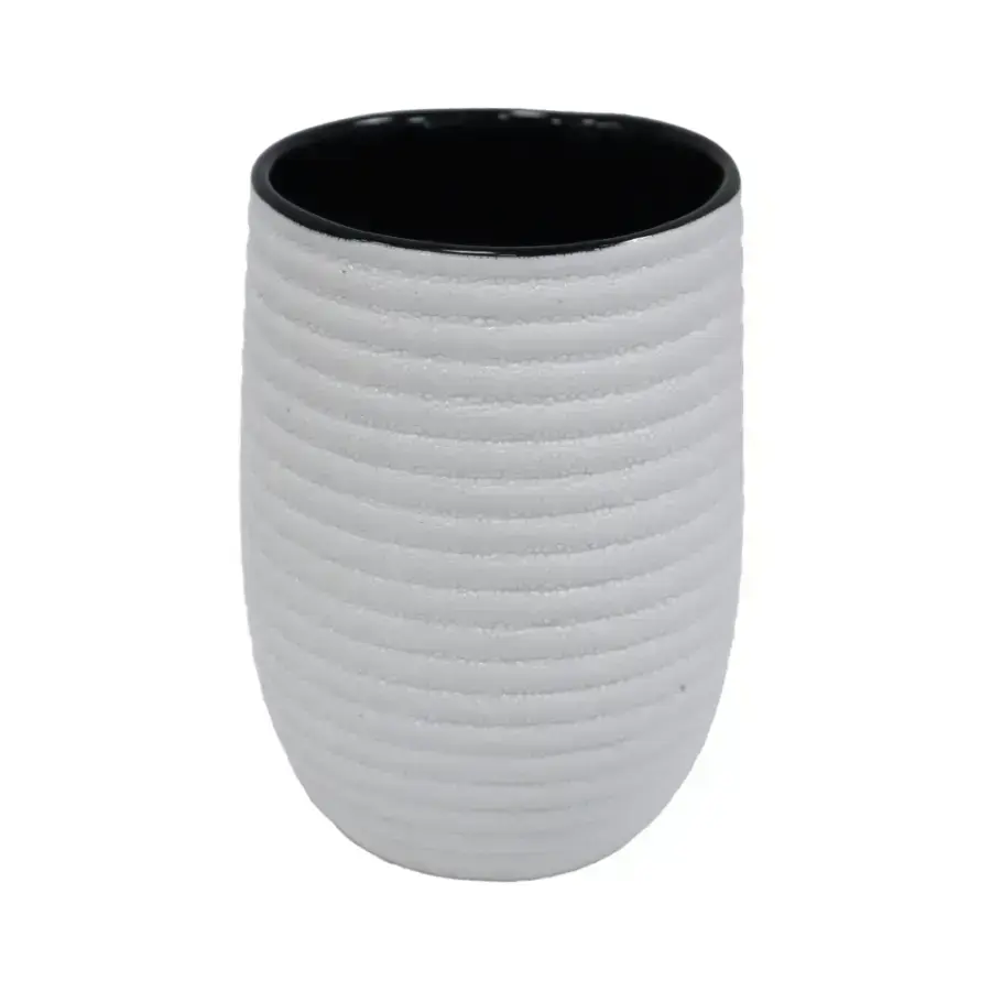 Universāla vannas istabas glāze no keramikas elegantā baltā krāsā ar melnu iekšpusi ir lielisks aksesuārs jebkurai vannas istabai. Tās rievotā virsma piešķir modernu un stilīgu izskatu, savukārt izturīgā keramika nodrošina ilgmūžību un vieglu kopšanu. Ideāli piemērota zobu birstu, zobu pastas vai citu ikdienas higiēnas piederumu glabāšanai. Pateicoties neitrālajam dizainam, glāze lieliski iederēsies dažādos interjera stilos.