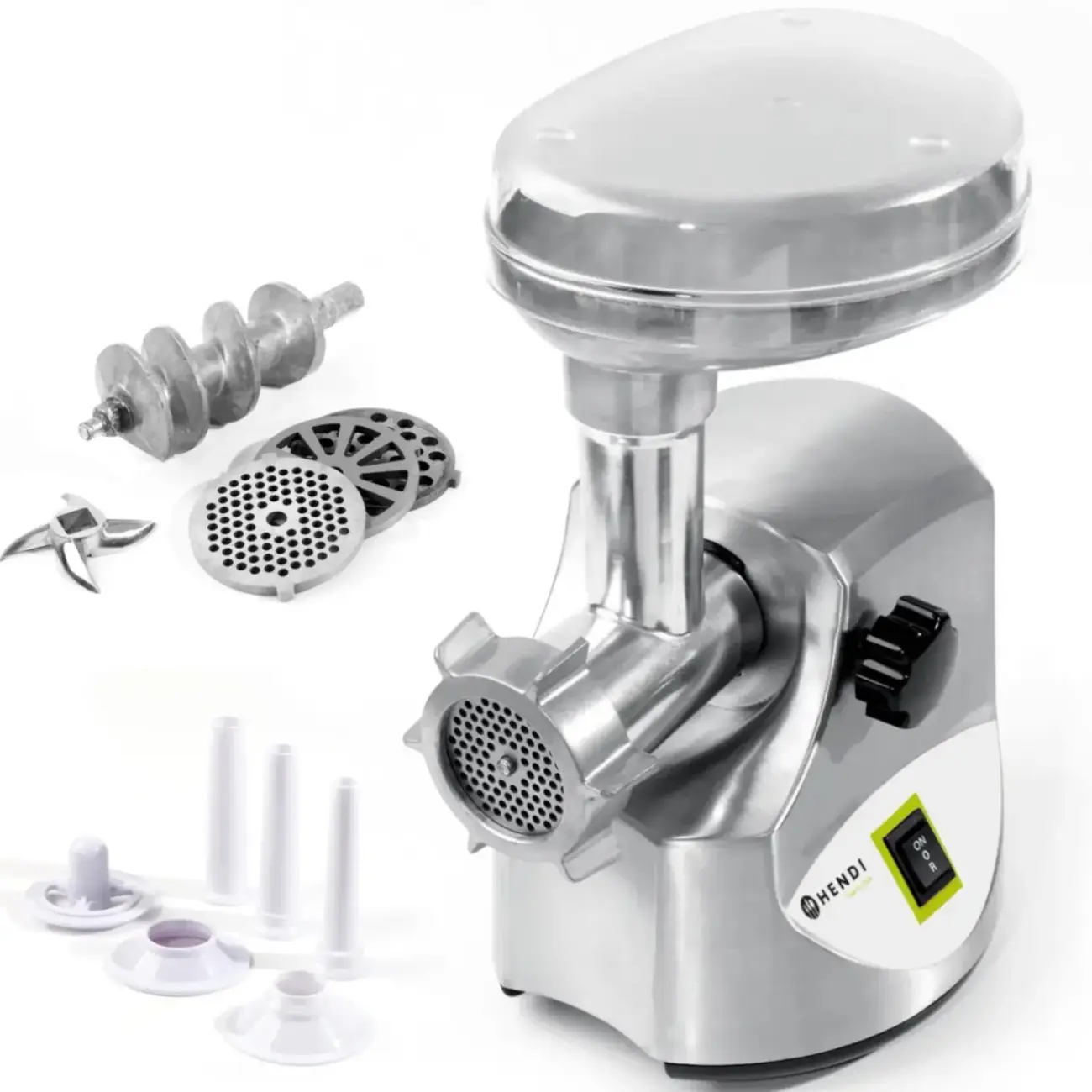 Maszynka do mielenia mięsa HENDI to profesjonalne urządzenie, które umożliwia szybkie i efektywne mielenie większych ilości mięsa. Dzięki mocy 400 W i wydajności mielenia do 50 kg/h urządzenie doskonale sprawdza się w gastronomii oraz w domowych kuchniach. W zestawie z maszynką znajdują się różnej wielkości końcówki i sitka, które pozwalają na uzyskanie różnych stopni mielenia mięsa. Maszynka jest łatwa w obsłudze i bardzo łatwa do czyszczenia, co pozwala na zachowanie odpowiedniej higieny podczas pracy.