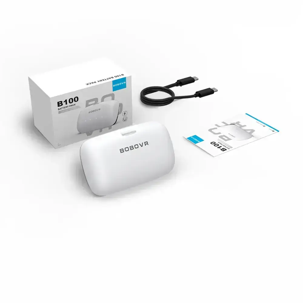 The BoboVR B100 is a new generation external battery designed for the S3 Pro and E3 Pro headsets, designed for long, stable VR sessions. Its increased 10,000 mAh capacity provides up to twice the usable power of the previous generation, while maintaining a compact size. An advanced power management system precisely controls charge level and operating temperature. The battery has been optimized for performance, lightweight design, and effective cooling. This solution supports comfort and continuous gameplay.