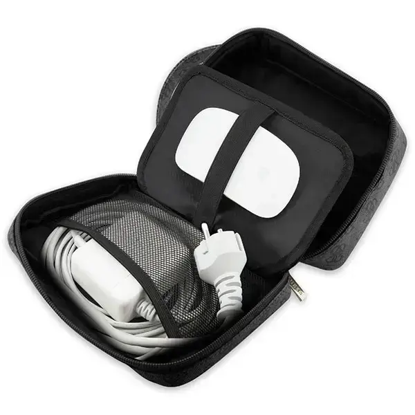 The interior of the bag is extremely functional - numerous compartments allow you to conveniently store the necessary small accessories. The bag has an external port terminated with a USB connector, and the inside of the bag hides a cable terminated with a USB connector.