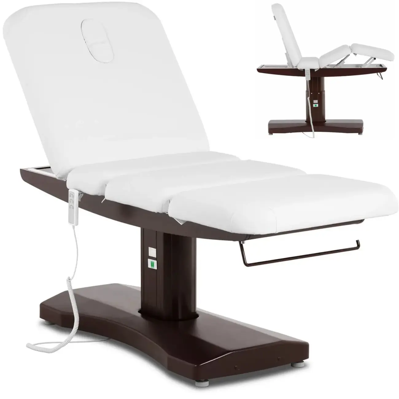 Fotel marki Physa świetnie sprawdzi się w salonach piękności i stylizacji rzęs, gabinetach podologicznych, ośrodkach odnowy biologicznej oraz pracowniach tatuażu. Nadaje się również jako łóżko do masażu. Mocne silniki zapewniają szybką regulację wysokości w zakresie 1345 ~ 1590 mm, podnóżka i oparcia o wymiarach 770 x 750 mm pod kątem 0 ~ +70deg;. Siedzisko o wymiarach 680 x 750 mm można ustawiać w zakresie 665 - 910 mm. W razie potrzeby można wyjąć poduszkę. Miękkie wypełnienie o grubości 100 mm pokryte zostało prostą w czyszczeniu, odporną na wodę oraz olejki ekoskórą PU. Uchwyt na rolkę papierowego ręcznika pozwala mieć ją zawsze pod ręką. Udźwig fotelu wynosi 200 kg.