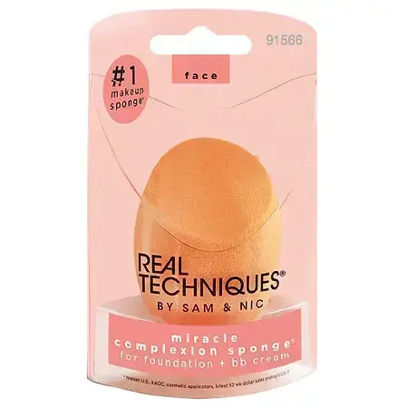 The Real Techniques Miracle Complexion Sponge flawlessly blends liquid and cream products with ease for a streak-free, luminous glow. Our best-selling makeup blending sponge offers a natural, dewy finish, and its micro-fine pores help create a seamless base with light to medium coverage. Real Technique's makeup sponge works best with liquid and cream makeup products such as foundation, skin tints, and illuminators. This makeup sponge has RT's unique 3-point application technique that makes blending products seamless. First use the flat edge of the makeup blender sponge to pack on product, then the precision tip to conceal, and finally, blend it all out with the rounded side. Use it damp for extra dewiness and let that inner glow shine through. The Miracle Complexion Sponge is easy to clean using our Real Techniques Brush + Sponge Cleansing Gel. It's also 100% cruelty-free, vegan, and designed with revolutionary latex-free foam technology. | Debenhams Miracle Complexion Sponge.